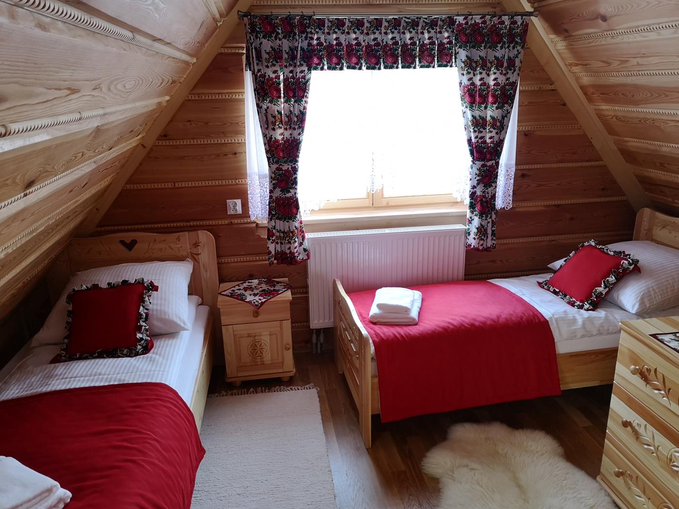 Piętro: Dwie przytulne sypialnie (2-osobowa oraz 3-osobowa), zapewniające prywatność i spokojny sen.
